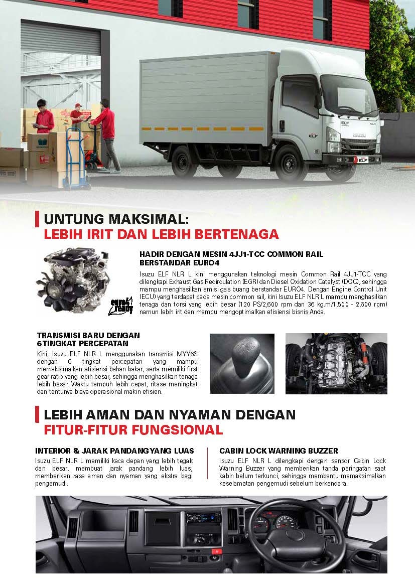 Dengan Engine Control Unit (ECU) yang terdapat pada mesin common rail, kini Isuzu ELF NLR mampu menghasilkan tenaga dan torsi yang lebih besar (120 PS/2.600 rpm dan 36 kg.m/1.500 rpm) namun lebih irit dan mampu mengoptimalkan efisiensi bisnis Anda.